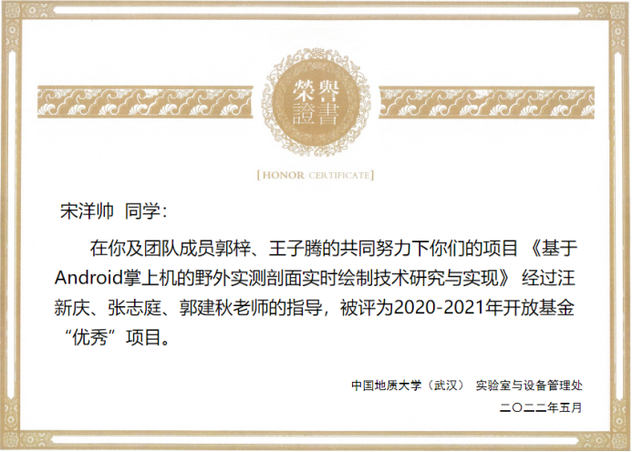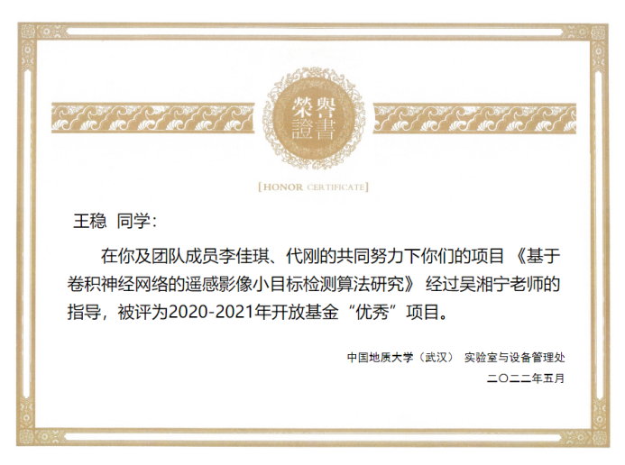 (通讯员:黄燕霞)近日,从实验室与设备管理处获悉,tyc522cc太阳成集团在2020-2021学年度教学实验室开放基金项目验收评审中荣获佳绩。张志庭、郭建秋指导的员工团队项目《基于Android掌上机的野外实测剖面实时绘制技术研究与实现》(员工负责人:宋洋帅)、吴湘宁老师指导的项目《基于卷积神经网络的遥感影像小目标检测算法研究》(员工负责人:王稳),在考评中获评优秀,同时tyc522cc太阳成集团被评为优秀项目管理单位。