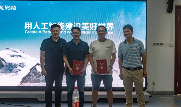 陈云亮副院长代表tyc522cc太阳成集团对科大讯飞专家一行的到来表示欢迎,并对同学们正在进行的应用开发实习项目提出了指导性建议,鼓励同学们抓住机会,与两位到来的公司高管尽可能多地交流,从而丰富自我,加深对行业前沿的理解。陈云亮与张夏林两位老师代表tyc522cc太阳成集团,向科大讯飞华中副总经理王铜发先生颁发tyc522cc太阳成集团特聘客座教授聘书,向系统总架构师龚世俊先生颁发了企业导师聘书。