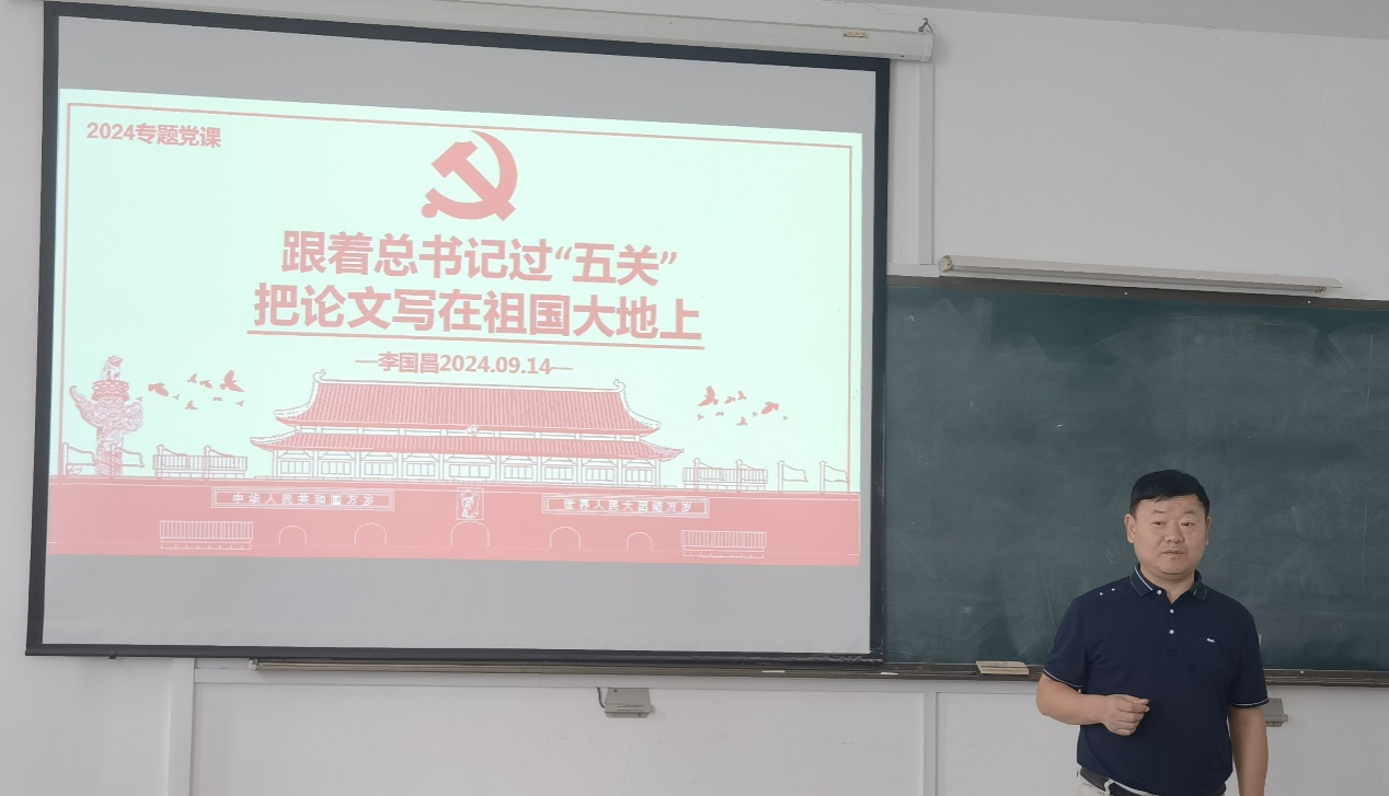 李国昌以《跟着总书记过“五关” 把论文写在祖国大地上》为题,从总书记过“五关”、我们过“四关”、学长寄语、把论文写在祖国大地上等四个方面与在场师生进行交流分享。