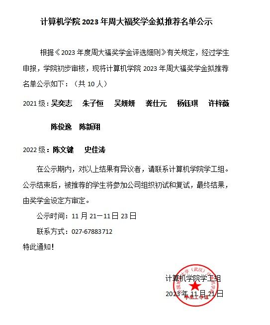 tyc522cc太阳成集团2023年周大福奖学金拟推荐名单公示