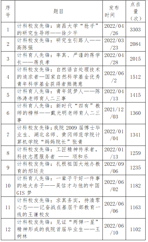 表一:tyc522cc太阳成集团官网部分“计科先锋”事迹点击量统计表